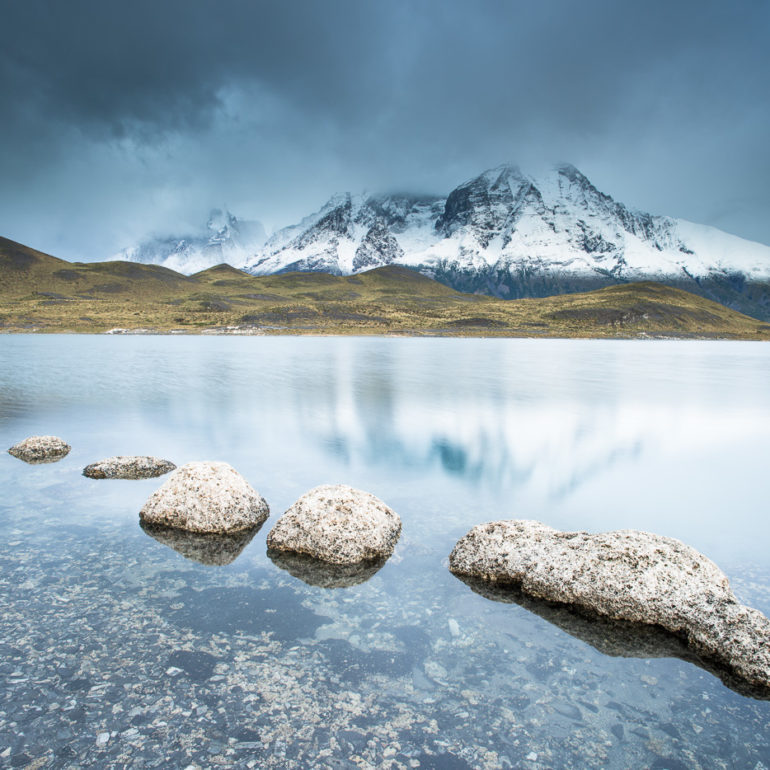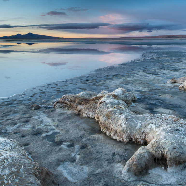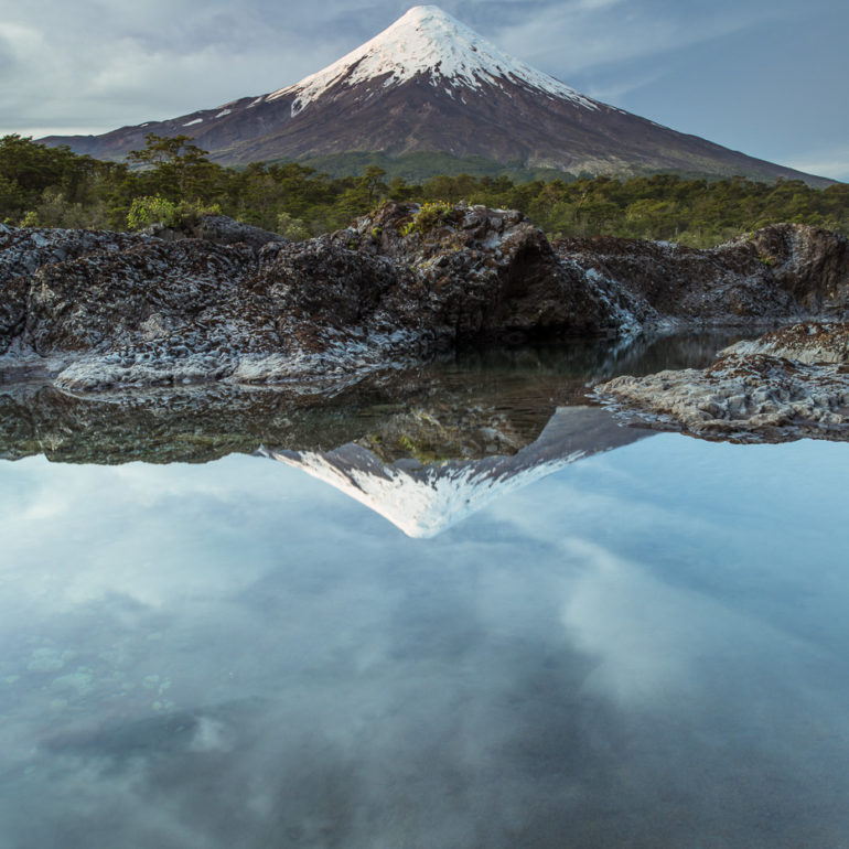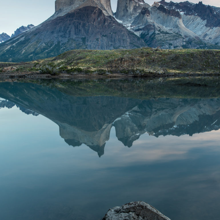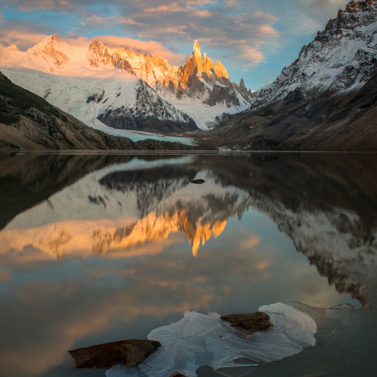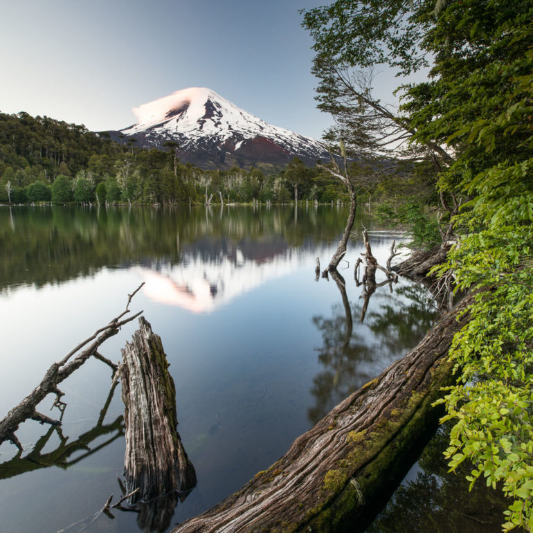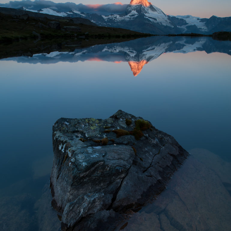 Die Bergspitze spiegelt sich im Wasser, die Farben spielen in Rot, Pink, Orange und es herrscht Stille am Morgen.